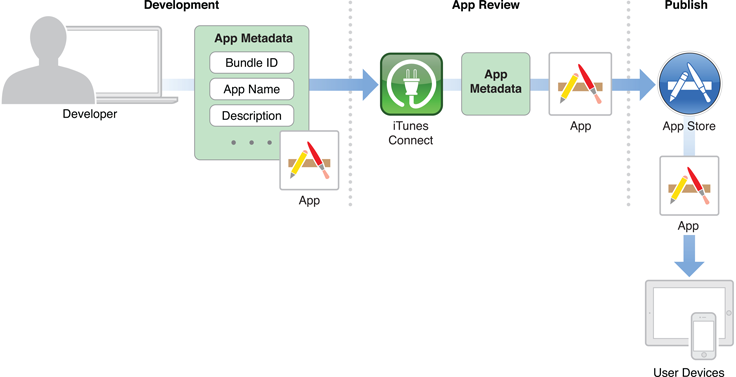 After your app is approved, you choose when it is published. Once published, the app bundle and metadata are copied from iTunes Connect to the App Store. There, users discover and purchase the app. Once purchased, the app bundle is downloaded to the user’s device.