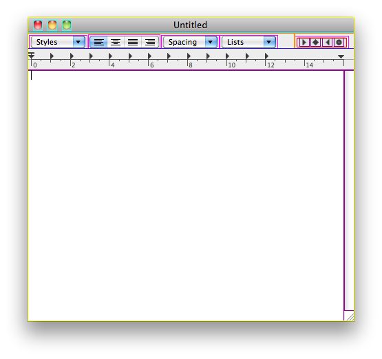 If you set the NSShowAllViews preference to YES, AppKit will draw outlines around each of the views in a window. Figure 5 shows how a standard TextEdit window looks with NSShowAllViews enabled.