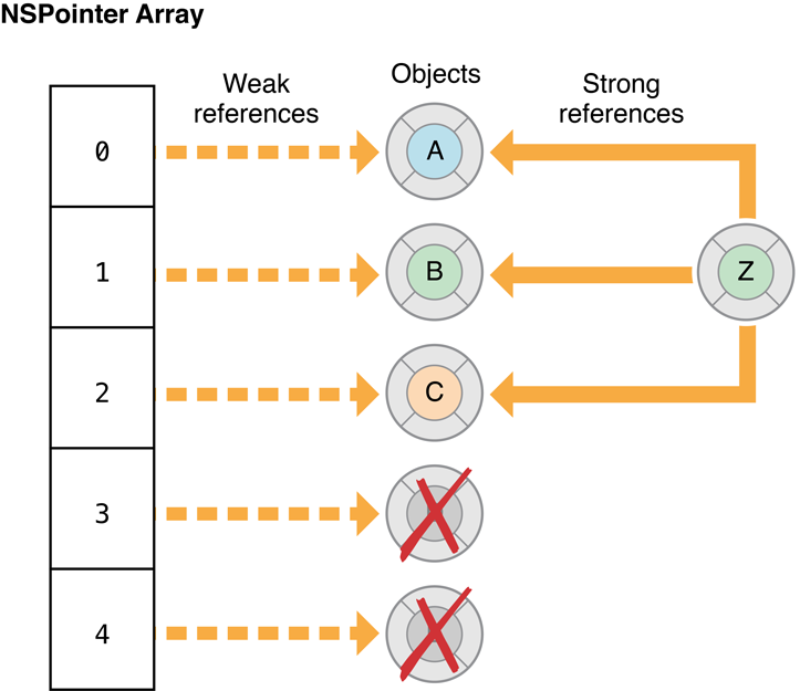You can use an NSPointerArray object when you want an ordered collection that uses weak references. For example, suppose you have a global array that contains some objects. Because global objects are never collected, none of its contents can be deallocated unless they are held weakly. Pointer arrays configured to hold objects weakly do not own their contents. If there are no strong references to objects within such a pointer array, those objects can be deallocated. For example, the pointer array in Figure 3 holds weak references to its contents. Object D and Object E will deallocated.