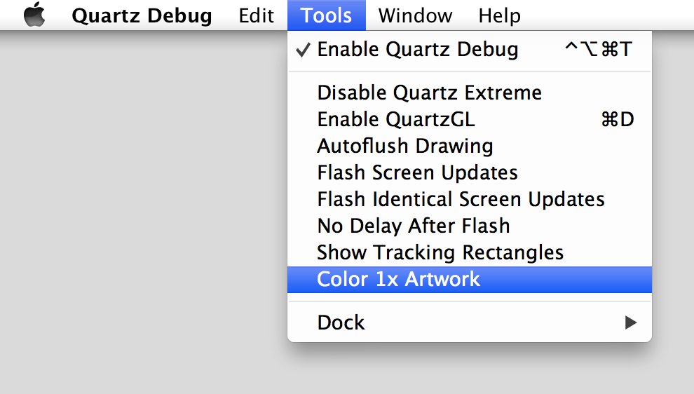 The easiest way to turn on the image-tinting option is from the Tools menu in Quartz Debug v4.2.