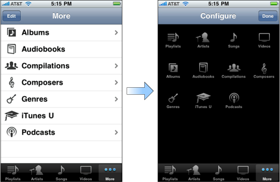 The More view controller provides built-in support for the user to modify the items displayed in the tab bar. For apps with lots of tabs, this support allows the user to pick and choose which screens are readily accessible and which require additional navigation to reach. The left side of Figure 2-5 shows the More selection screen displayed by the iPod app. When the user taps the Edit button in the upper-left corner of this screen, the More controller automatically displays the configuration screen shown on the right. From this screen, the user can replace the contents of the tab bar by dragging new items to it.