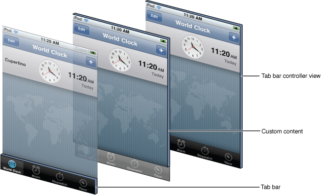 Figure 2-1 shows the tab bar interface implemented by the Clock app. The tab bar controller has its own container view, which encompasses all of the other views, including the tab bar view. The custom content is provided by the view controller of the selected tab.