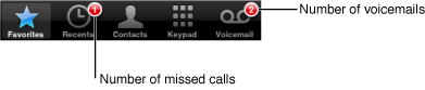 A badge is a small red marker displayed in the corner of the tab. Inside the badge is some custom text that you provide. Typically, badges contain numerical values reflecting the number of new items available on the tab, but you can also specify very short character strings too. Figure 2-6 shows badges for tabs in the Phone app.