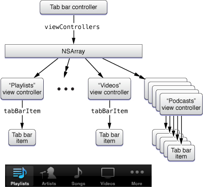 Figure 2-2 shows the relationship of the tab bar controller to its associated view controllers. Each view controller in the tab bar controller’s viewControllers property is a view controller for a corresponding tab in the tab bar.