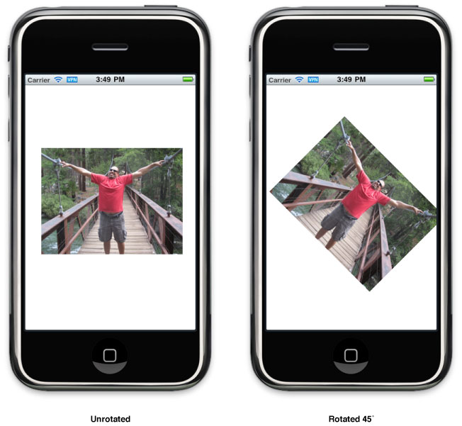 Applying the transform in the preceding code to a view would rotate that view clockwise about its center point. Figure 3-2 shows how this transformation would look if it were applied to an image view embedded in an application.
