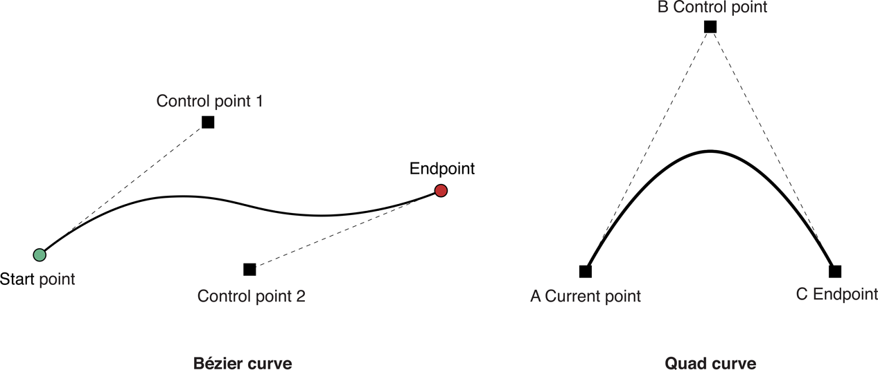 The UIBezierPath class provides support for adding cubic and quadratic Bézier curves to a path. Curve segments start at the current point and end at the point you specify. The shape of the curve is defined using tangent lines between the start and end points and one or more control points. Figure 2-3 shows approximations of both types of curve and the relationship between the control points and the shape of the curve. The exact curvature of each segment involves a complex mathematical relationship between all of the points and is well documented online and at Wikipedia.