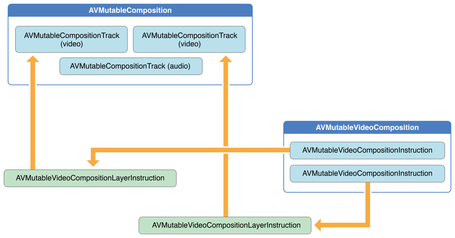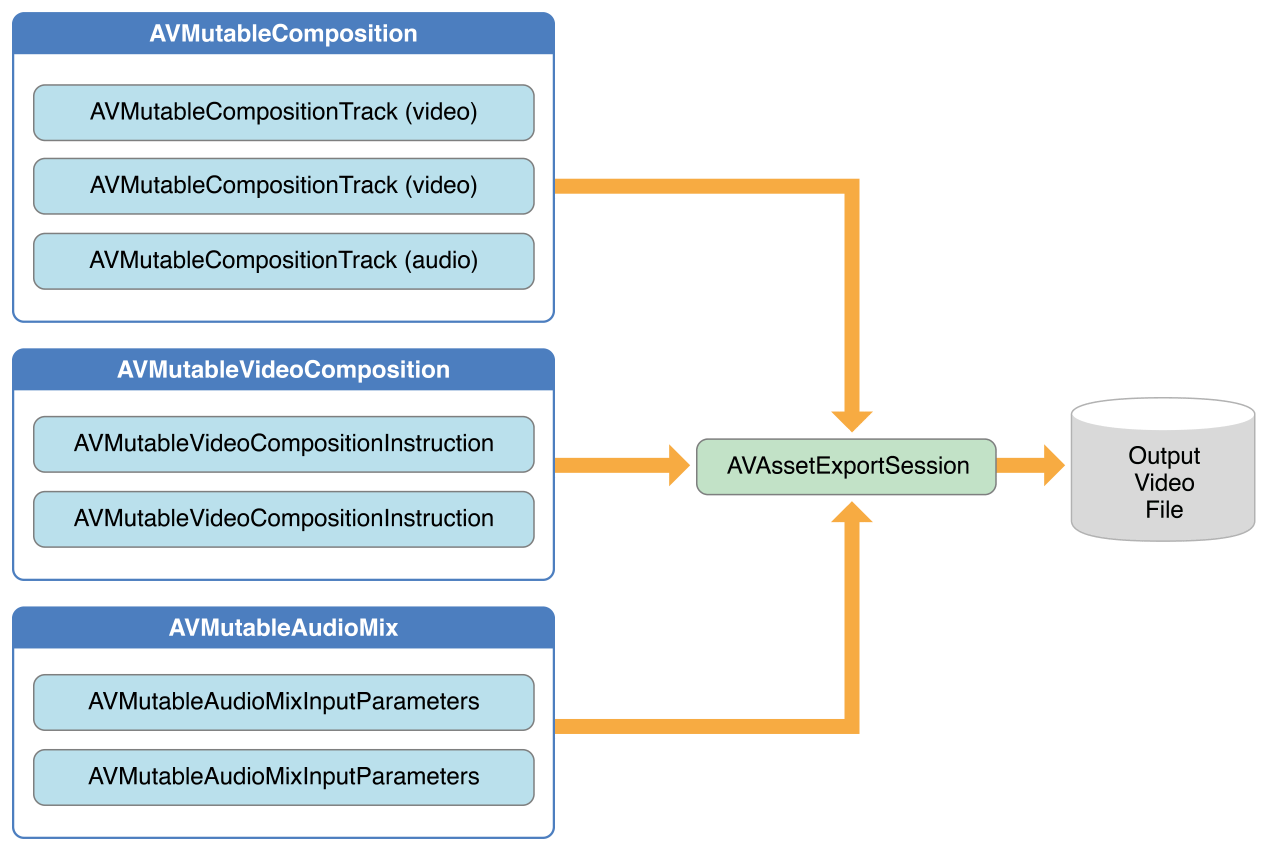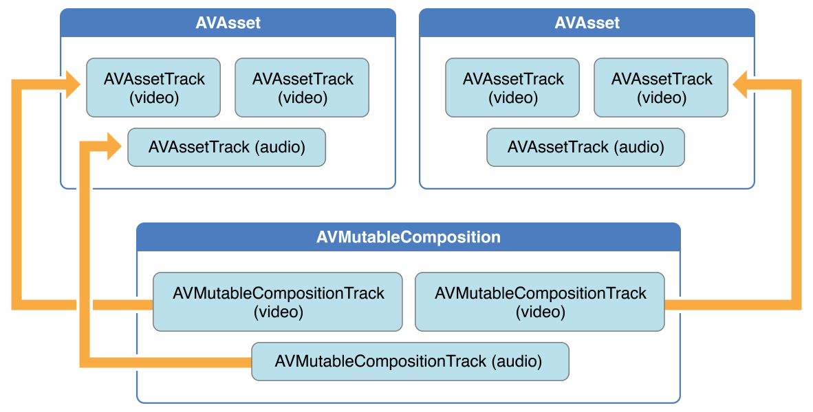 The AVFoundation framework provides a feature-rich set of classes to facilitate the editing of audio visual assets. At the heart of AVFoundation’s editing API are compositions. A composition is simply a collection of tracks from one or more different media assets. The AVMutableComposition