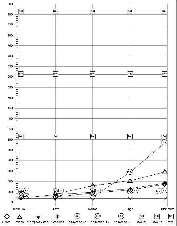 All of the graphs show the compressed data size (in kilobytes) versus the quality of an image at minimum, low, normal, high, and maximum compression settings. The Raw Compressor is included to show the size of the image in raw pixels. The Raw Compressor is not useful for storing still images, since it does not even use the simple packing technique used by QuickDraw (notice that the 24-bit raw format is larger than the uncompressed PICT file).