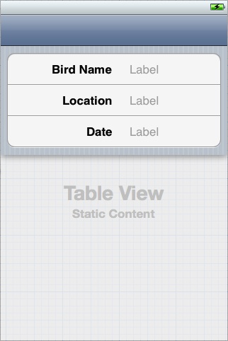• Static cells. Use static content to design the overall layout of the table, including the total number of cells. A table view with static content has a fixed set of cells that you can configure at design time. You can also configure other static data elements such as section headers. Use static cells when a table does not change its layout, regardless of the specific information it displays. Figure 4-4 shows a grouped table view with three static cells.
