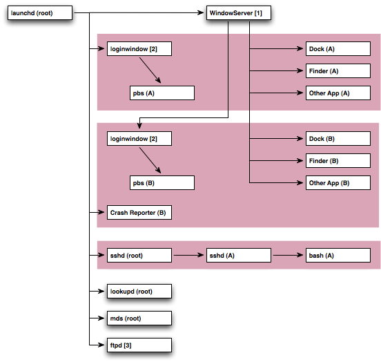 . The second instance, created when user A fast user switched to user B, is a child of the window server.Each instance of