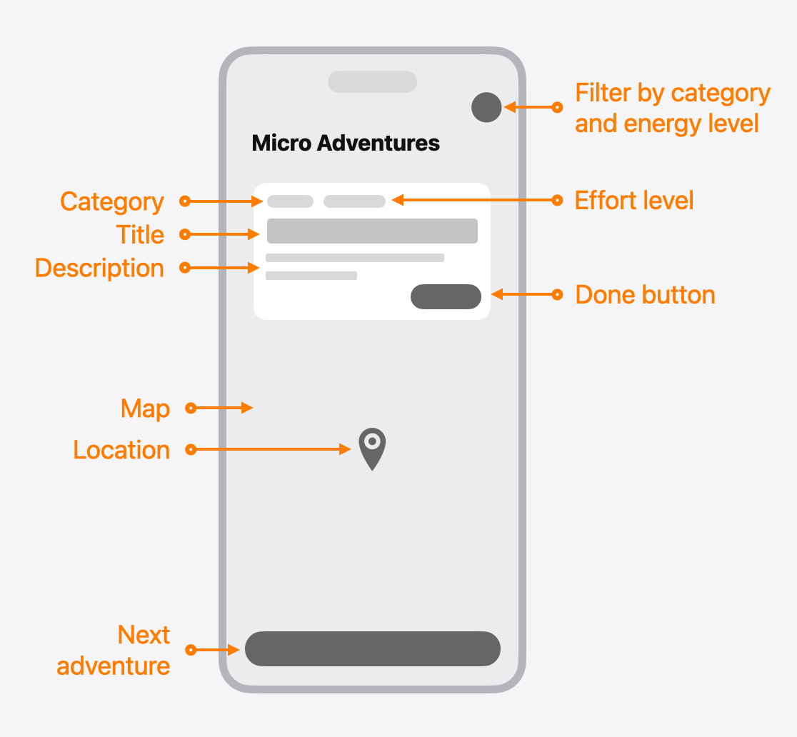 Add a wide "Next Adventure" button that floats above the lower part of the map.