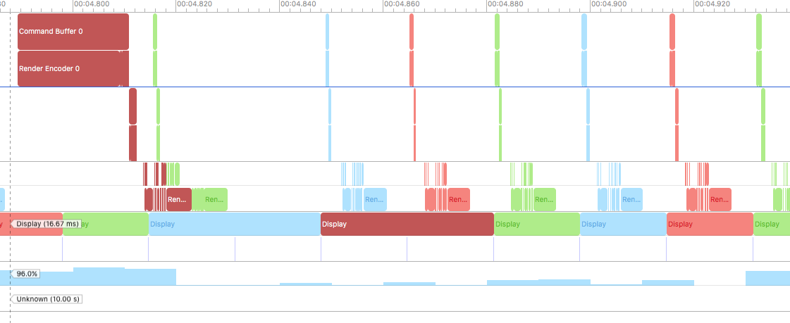 I am trying to figure out why our game cannot hit a 100% steady 60 FPS in the Core Animation FPS inspector. It seems to run at several 'ticks' at 60, then there is one 59, then a few 60s, etc. So I turned to the Metal Trace tool and indeed I can find a couple of "Surface was displayed for 33.xx ms" events. But by looking at the trace, I do not understand *why* this frame is displayed for that time. See the screenshot: