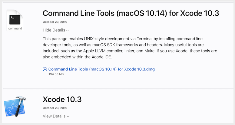 I have an existing dev PC with XCode 10.3 on it, and I need to add the command line tools. While XCode 10.3 has been removed from the store, and the built-in install and update facilities inclusind the xcode-select command line do all fail. XCode 10.3 it is still available for download here. The XCode tools are, however, not, in the list version 10 is missing entirely, there is a gap in the downloads between version 4.6 and 11.0. Where can I get the package?