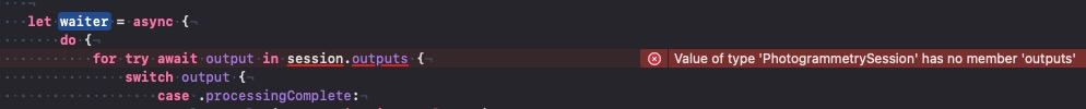 API documentation and Demo show photogrammetrysession has property ouputs https://developer.apple.com/documentation/realitykit/photogrammetrysession