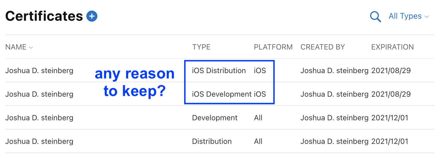 A while ago, we iOS developers had iOS Developer and iOS Distribution certificates. I still have an active pair. But then Apple moved to Apple Developer and Apple Distribution certificates. Even though I only develop for iOS, I've used those Apple Dev and Dist certificates exclusively with my iOS apps for at least a year now. But I still have all 4 certificates active. The two iOS certificates are about to expire -- Apple sent me a courtesy email notification suggesting I need to do something. But now I'm not sure I need to do anything. Is there any reason why I need to keep active the old iOS Dev and iOS Dist certificates if I'm keeping and using the Apple Dev & Dist certificates?