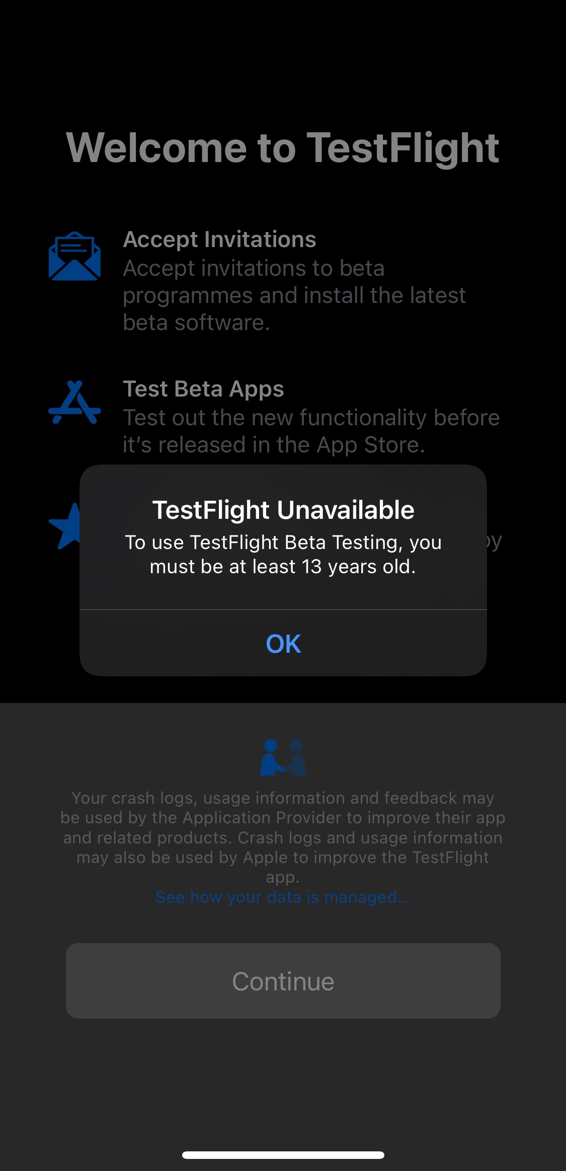 Hey 👋 I’ve been trying to log into TestFlight for a while now and every time i tried it showed the same error message: “To use TestFlight Beta testing, you must be at least 13 years old.”