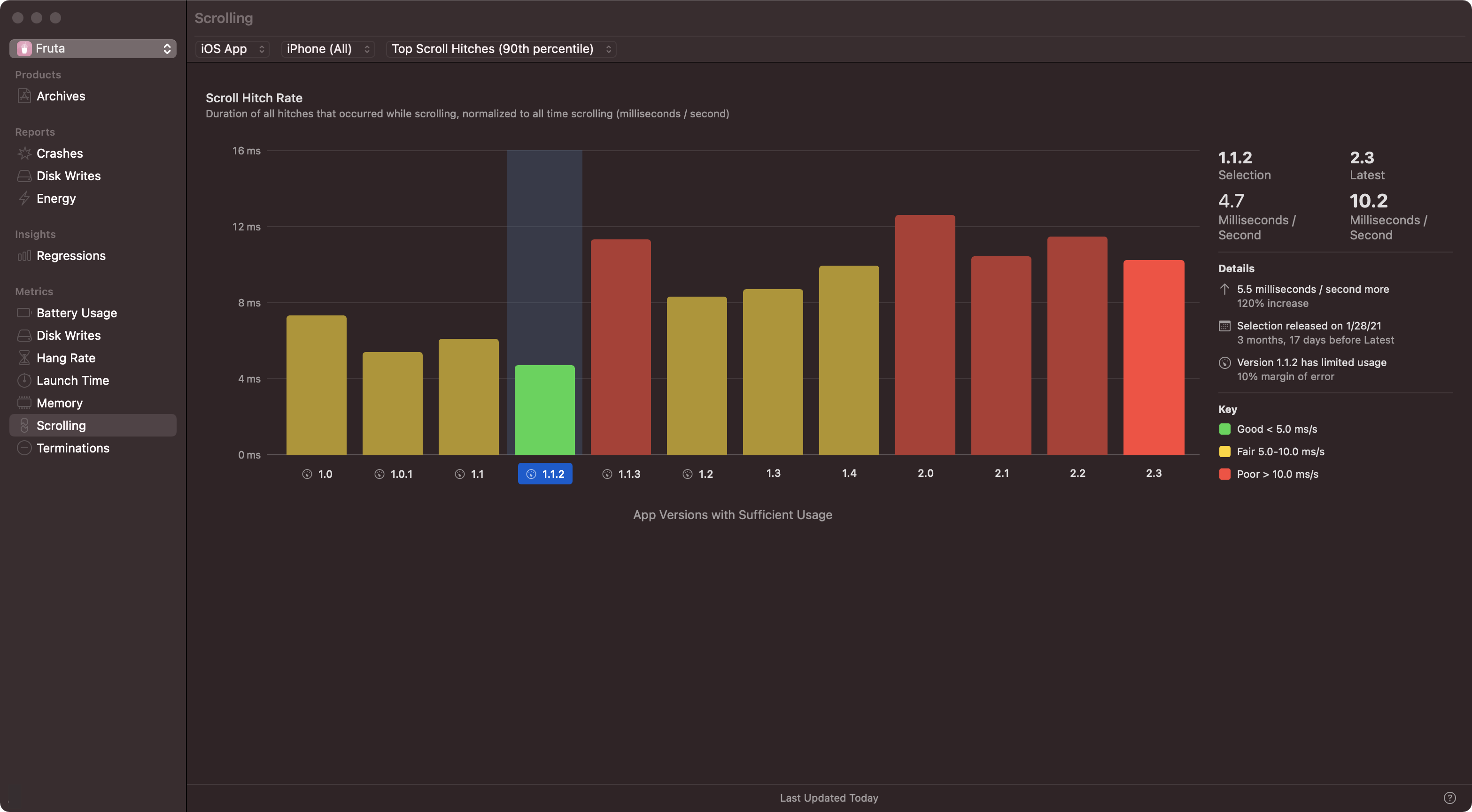 In Xcode 12.5.1, looking at the (Scrolling) metric in our project and comparing it to the following image from your documentation: https://docs-assets.developer.apple.com/published/ead368de5bf65301780cb2be5cbab4d8/10500/improving-app-responsiveness-1~dark@2x.png