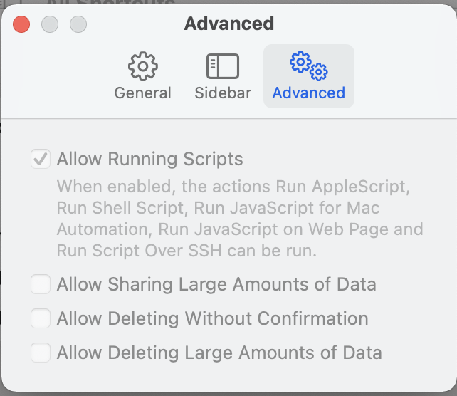 Hi! I'm exploring Shortcuts on macOS, and trying to use 'Run Shell Script' in my shortcut, but it terminates with an error 'This shortcut cannot be run because this action is a scripting action and your Shortcuts security settings don’t allow you to run scripting actions'. 'Allow Running Scripts' is enabled, but the shortcut is still not working. What am I doing wrong?