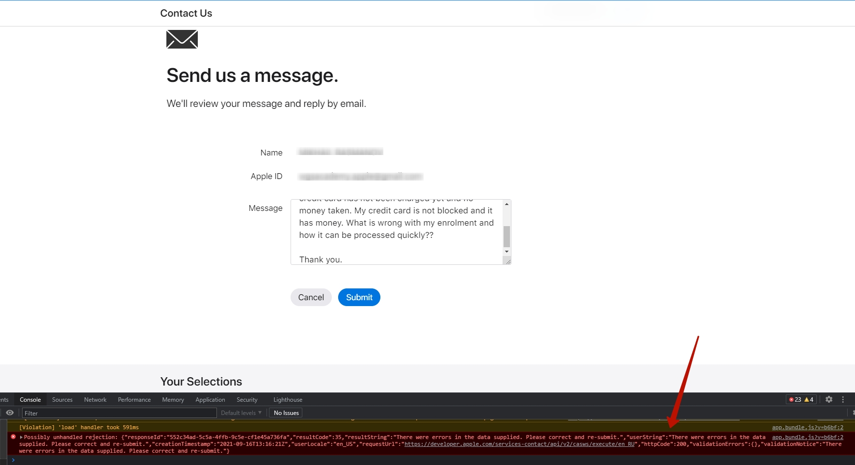 I can't send a request to technical support using this form https://developer.apple.com/contact/topic/SC1101/subtopic/30006/solution/EML/details