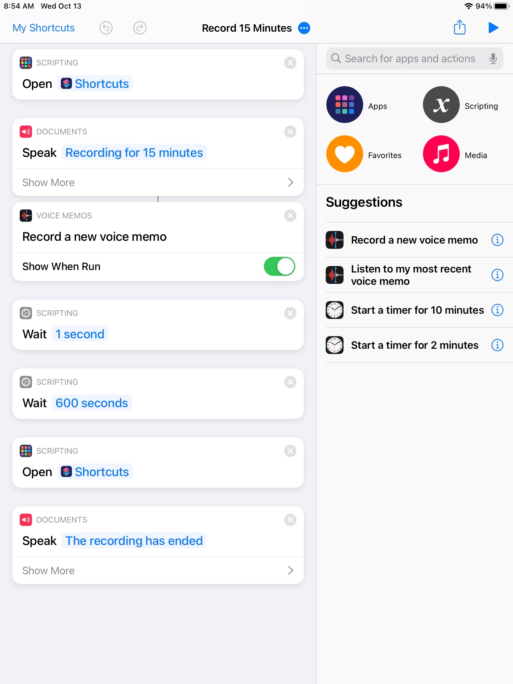 Is there a better way that forces Voice Memo to stop recording after 10-15 minutes (as part of the shortcut) and saves the audio file? I want this to happen without manually stopping Voice Memo because it’s for someone with low vision who would have issues stopping Voice Memo manually.