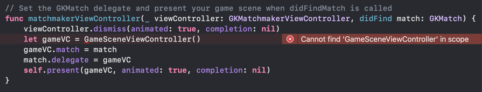 However, I'm getting an error on the GameSceneViewController line. I've tried this with both a Game and an App template in Xcode 13, but both get hung up here.