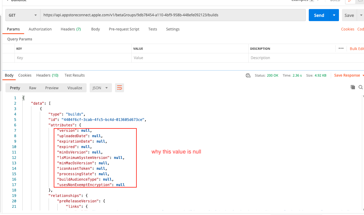 It looks like Apple made a change on the backend between late Wednesday the 13th and early Thursday the 14th which now has multiple App Store Connect API endpoints returning "null" values for build specific information. At least this is when I started noticing the changes.