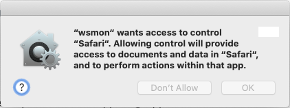 When wsmon communicate with Safari, wants access to control Safari dialog opens. I click OK and the agent successfully communicates with Safari.