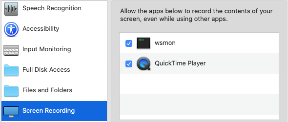 I run System Preferences and check wsmon to allow record screen. It is correct, but I expected to see App instead of wsmon, because wsmon is part of App.app.