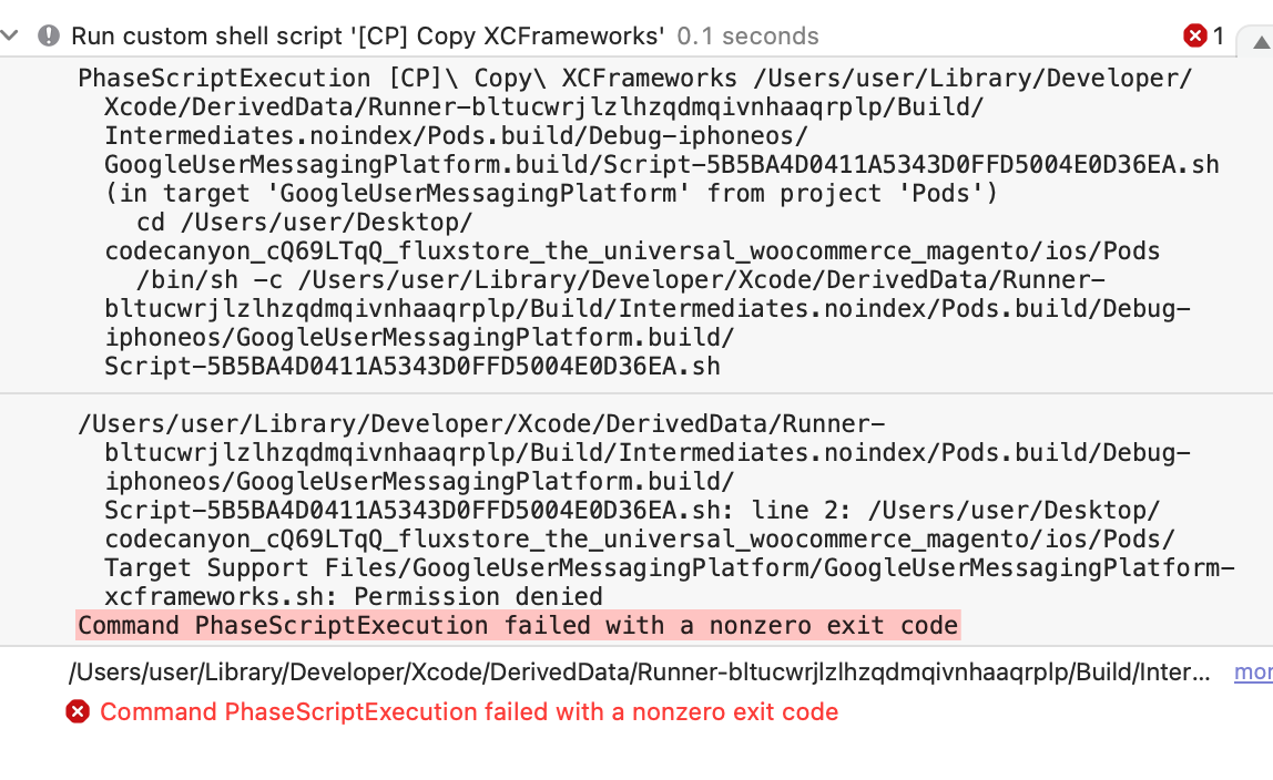 Hi! I am trying to build a Flutter project, but I keep getting this message : Target Support Files/GoogleUserMessagingPlatform/GoogleUserMessagingPlatform-xcframeworks.sh: Permission denied Command PhaseScriptExecution failed with a nonzero exit code I tried pod init / pod install / etc. but I get messages there like