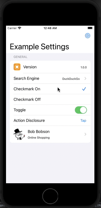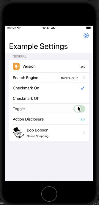 Some of these views have accessories such as UISwitch elements and some display things like a .checkmark. They all render fine and ultimately they update to the expected state after applying the section snapshot. I expect this as the Identifiable ID has not changed, but the equatable check has. However, when the associated data item is updated it animates the change with a slight fade.