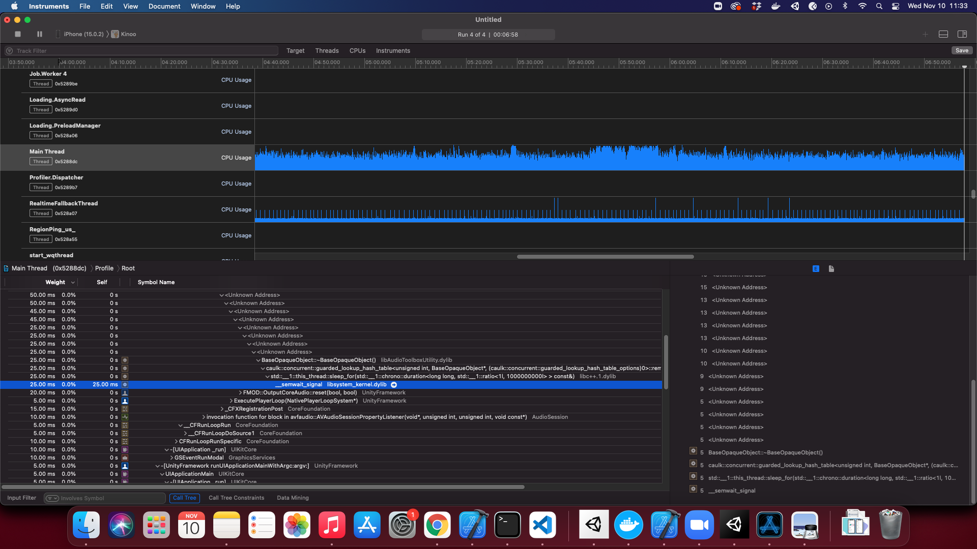 frame #8: 0x00000001159abba0 UnityFramework`FMOD::OutputCoreAudio::reset(bool, bool) + 472