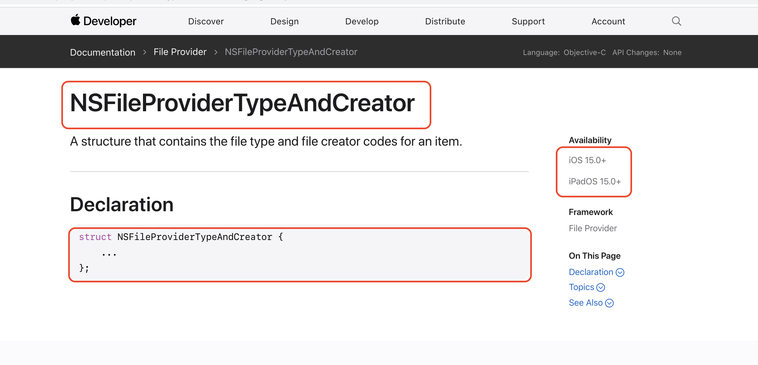 Also, when I use the NSFileProviderTypeAndCreator struct in iOS, XCode throws an error saying the struct is not available.