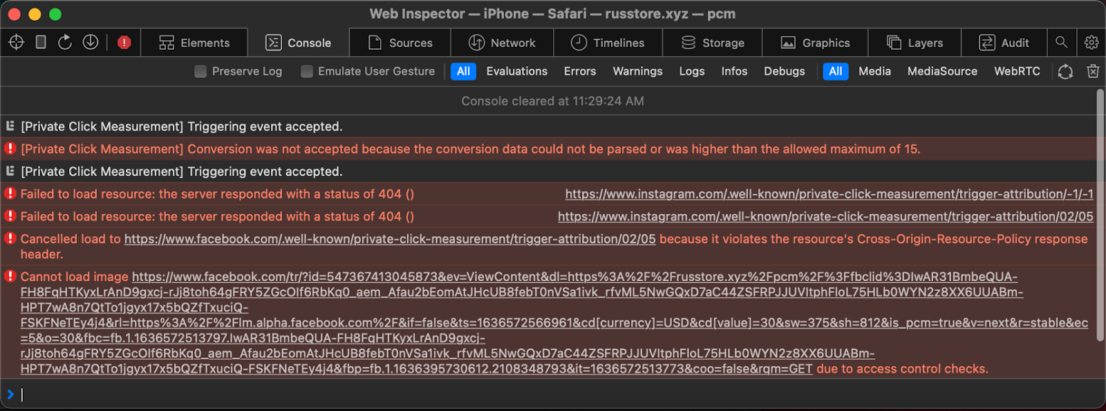 Note that we see “[Private Click Measurement] Triggering Event Accepted,” in the console, which seemed to suggest that the Step 2 Data was accepted and that Safari should send the conversion to step 3. Since PCM Debug Mode is on, we should see the request to our Step 3 endpoint in 10 seconds. However, our sniffer(Charles) didn't detect any traffic to the attribution URL(https://www.example.com/.well-known/private-click-measurement/report-attribution/).