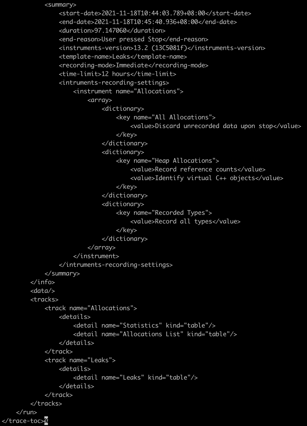 I have seen that I can export table data from traces containing Allocations, Leaks, and VM Tracker instruments using xctrace export on the command line in XCode 13 release notes. But I still cannot see the table data when I use xctrace export --input xxx.trace --toc