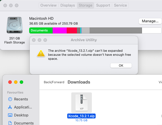I have downloaded Xcode 13.2.1 ( 10.75 GB ) from Apple website . But i am unable to expand the xip file . i have 36 GB free space .