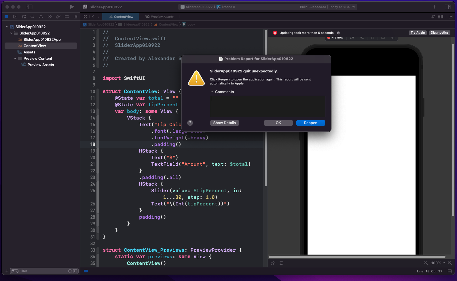 Newbie here. Using Xcode 13.2.1. I'm on a Linkedin Learning course on appmaking. Going smoothly till I'm asked to preview the work. Keeps crashing. Visited a bunch of sites for advice but I'm probably not seasoned enough to understand a bunch of it. Let me know what information you need. Thanks!