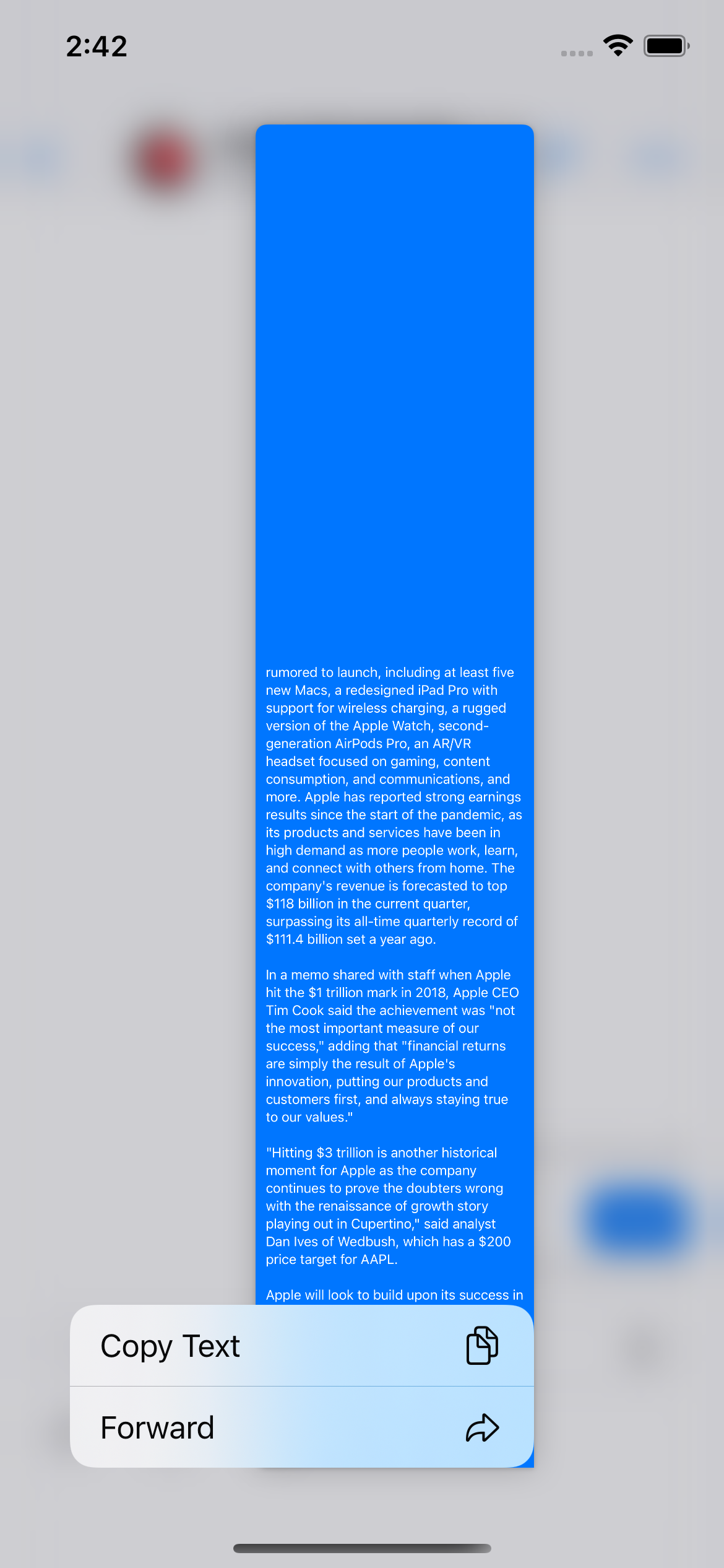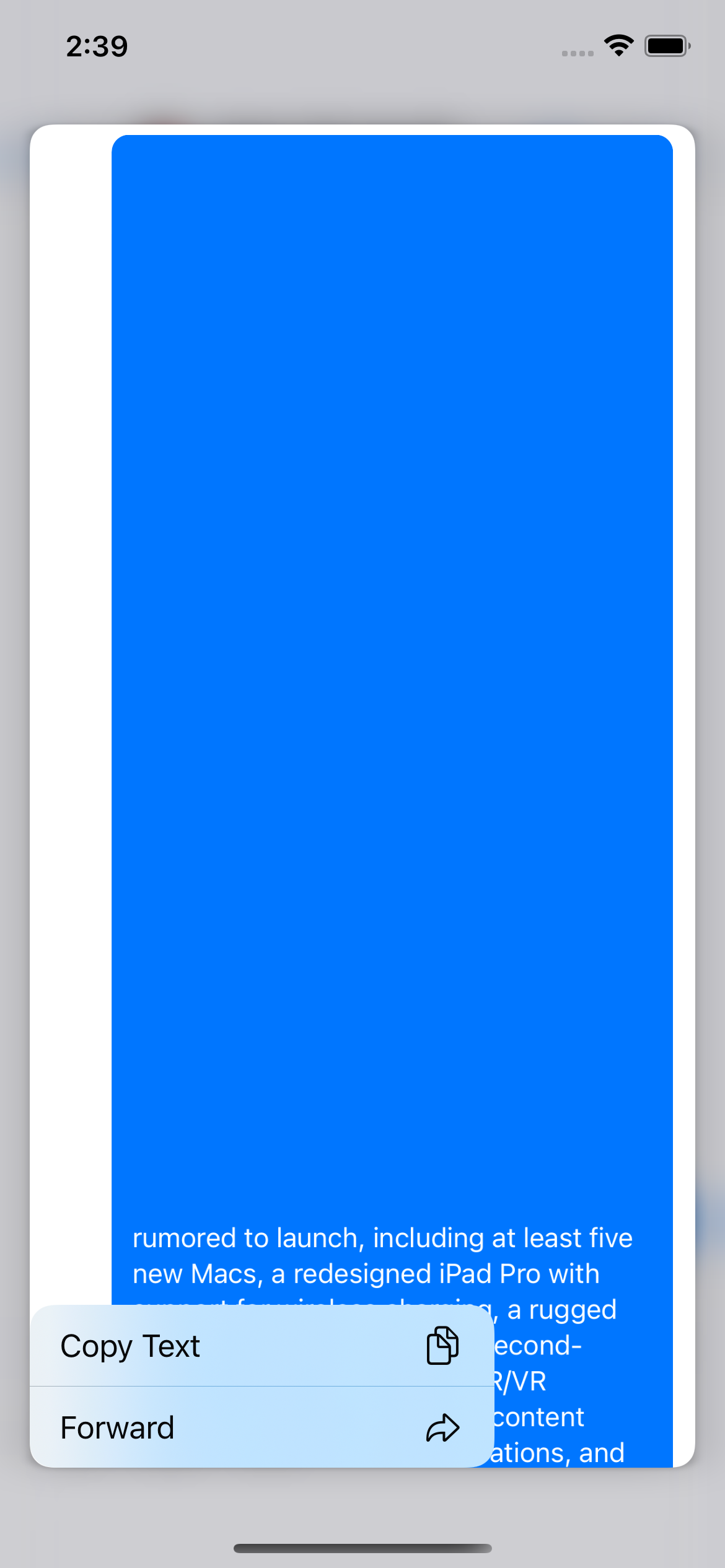 If changed to only show the textview in the preview, on top of the blank issue I just mentioned, it also scale fit the screen instead of maintain the width of the textview (see attachment textviewAsUITargetedPreview.png).