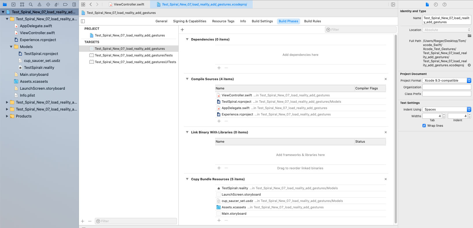 I have completed a tutorial in which I had to load an usdz-file into Xcode and then add gestures to it. It worked fine. But if I replace the usdz-file with a .reality-file or .rcproject-file I created in RealityComposer it fails with the message: Thread 1: Fatal error: 'try!' expression unexpectedly raised an error: RealityKit.Entity.LoadError.resourceNotFound("TestSpiralr") (TestSpiralr is the .reality-file) how do I get the script running. Thanks