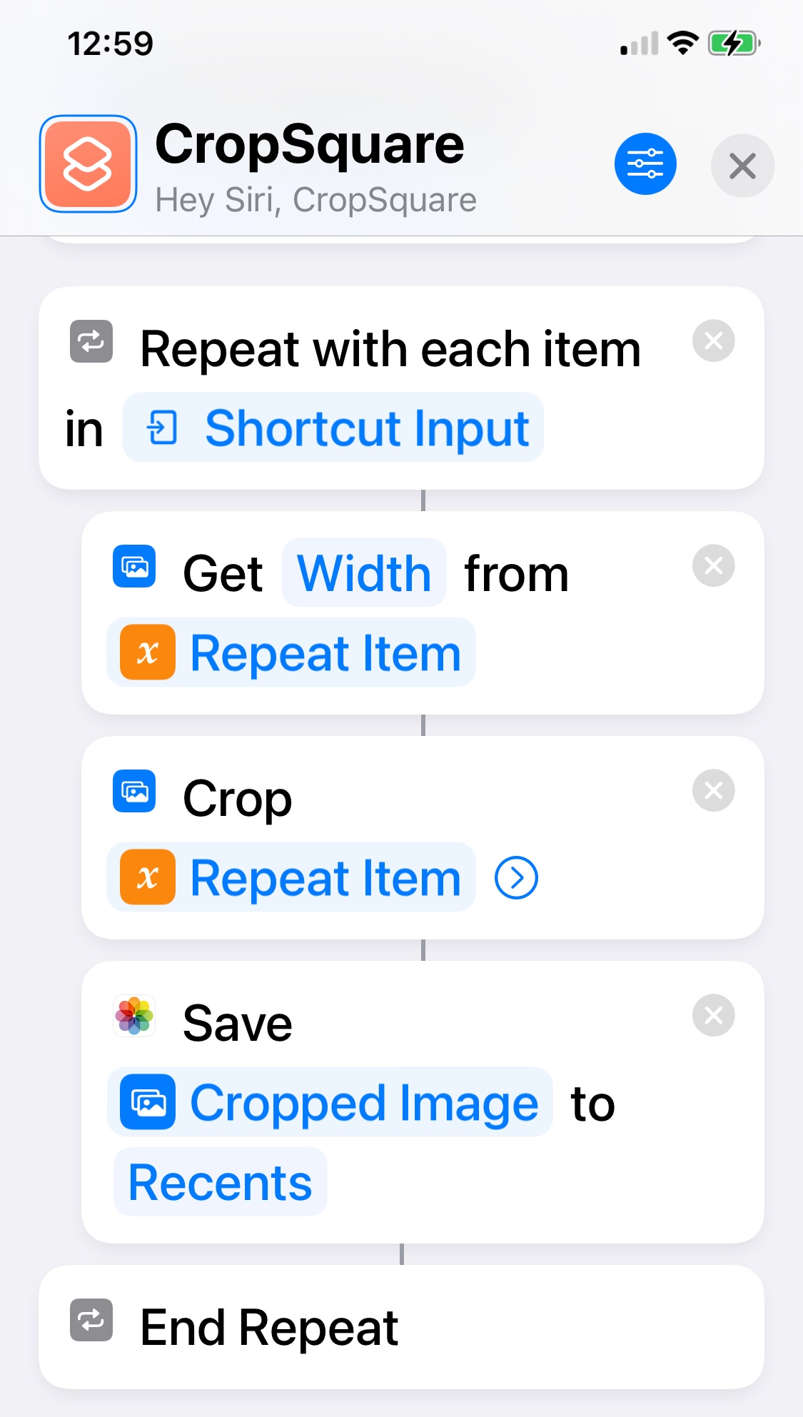 Hello, I've built a shortcut that crops images into a square format of (width x width). The shortcut works well for photographs, but not so for screenshots. While the result is a square image, the size is smaller by a factor of 3.123 on each side. Also the resulting image seems to be squashed vertically