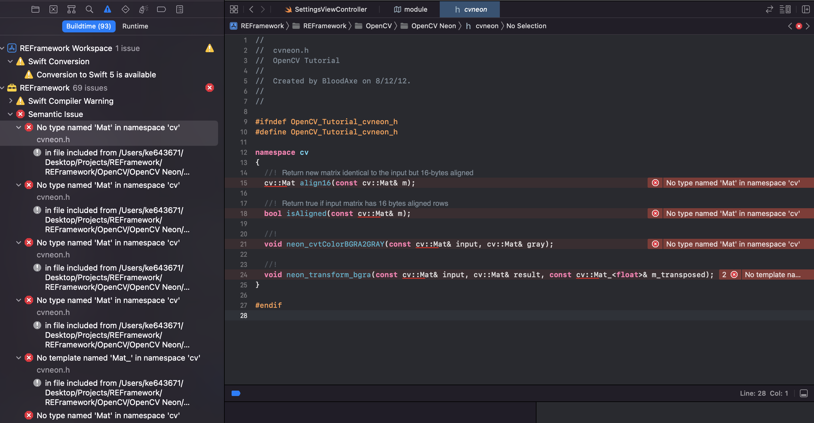 /Users/***/Desktop/Projects/**Framework/**Framework/OpenCV/OpenCV Neon/cvneon.h:15:29: No type named 'Mat' in namespace 'cv'