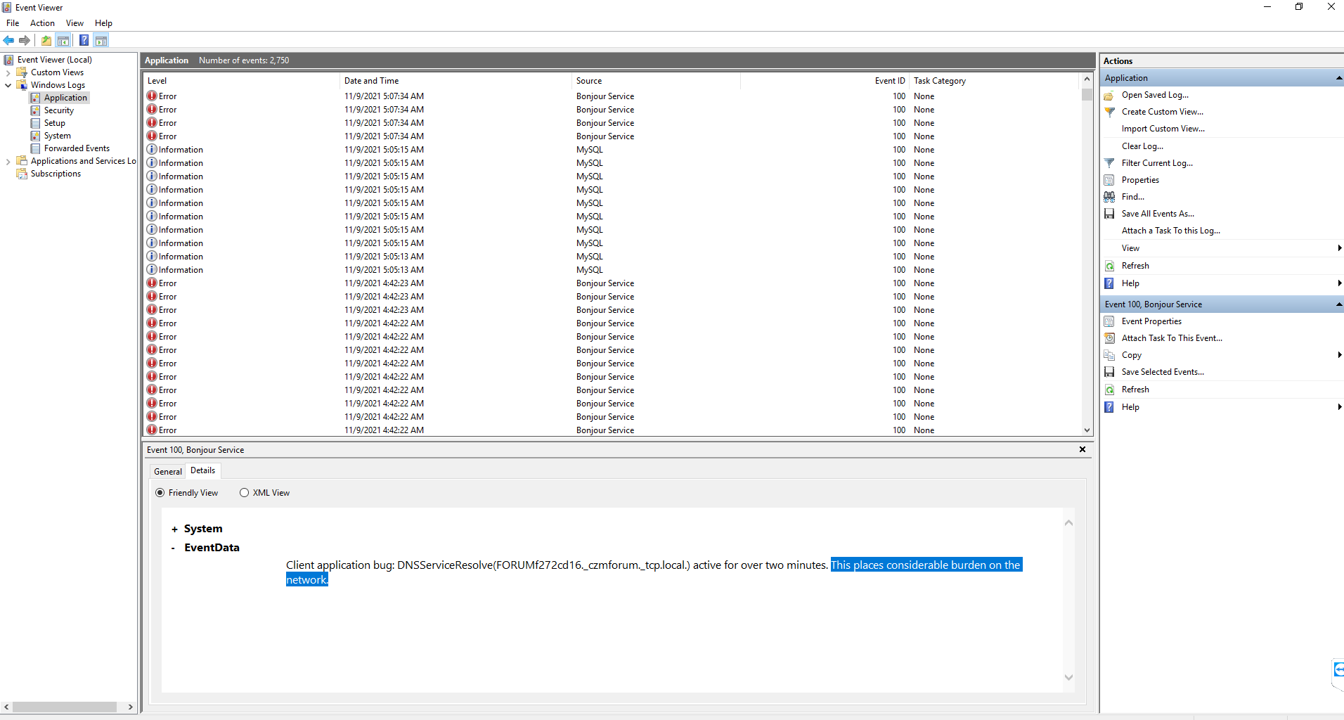 Hello, We are using Bonjour service for browsing/announcing some services. Everything works fine except the windows event are flooded with Error - "DNSServiceResolve active for over two minutes. This place a considerable burden on the network".