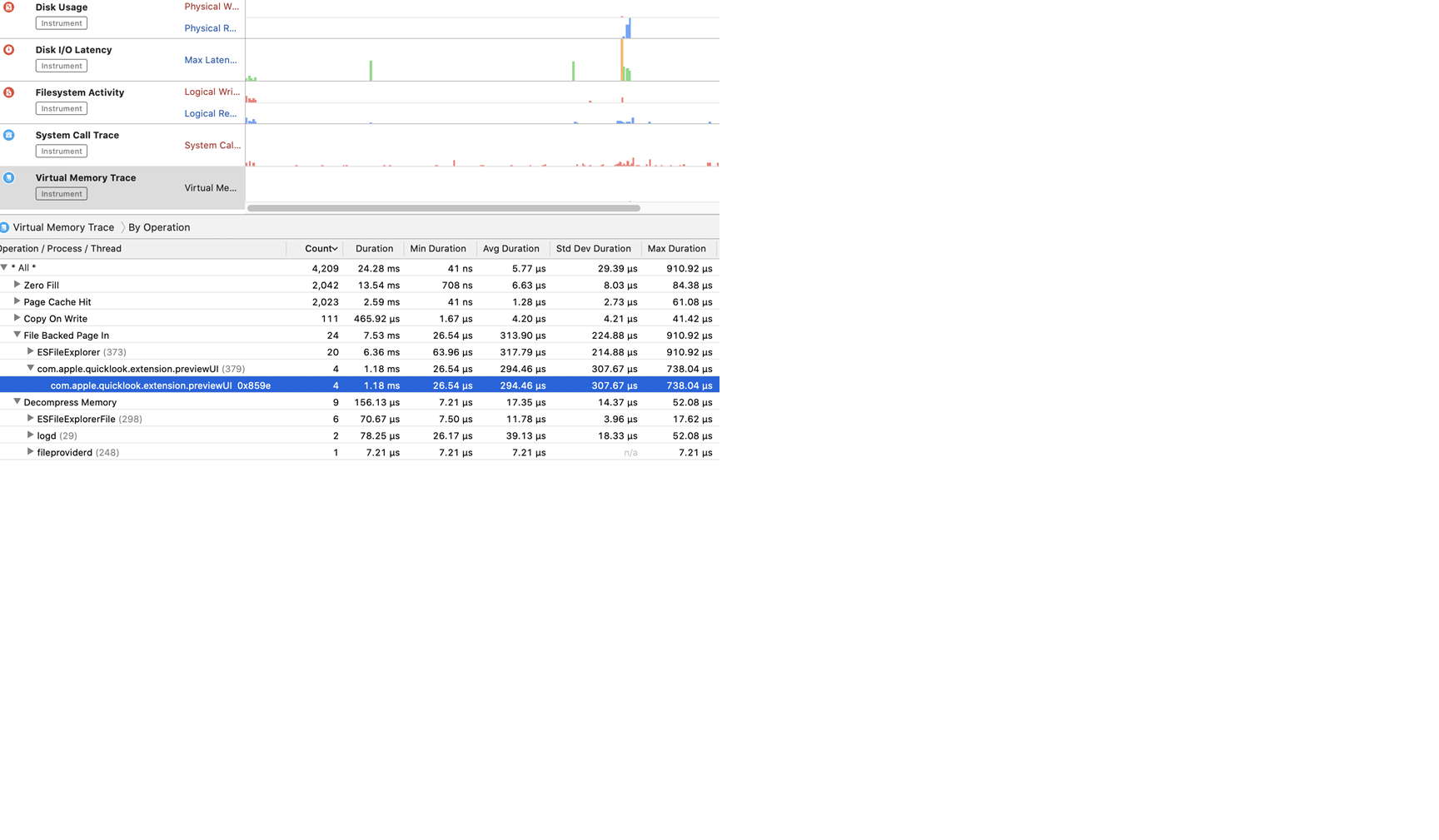 - In "Virtual Memory Trace", it shows totally 4-times of "File Backed Page In" operations, and each operation size is 16K. (Please refer to P2.png & P3.png attached)