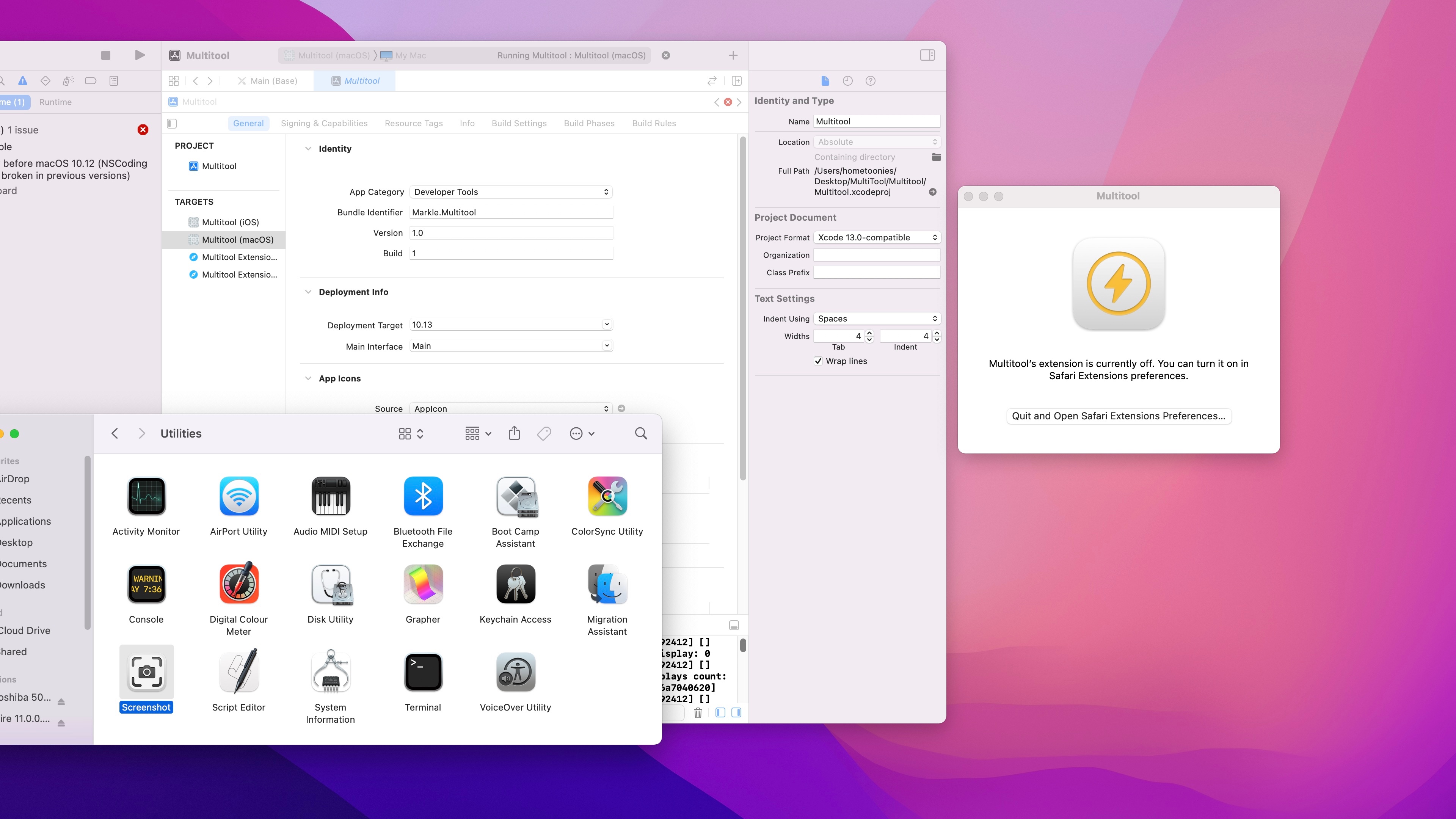 I wrote a script in Xcode using nasm assembly to utilise telephony to begin writing a prefpane for safari called Multitool that you can configure your router with. It builded successfully but only the popup on the right appeared and it seems my compiled code has gone missing as I get no extension in safari. Can anyone assist ?