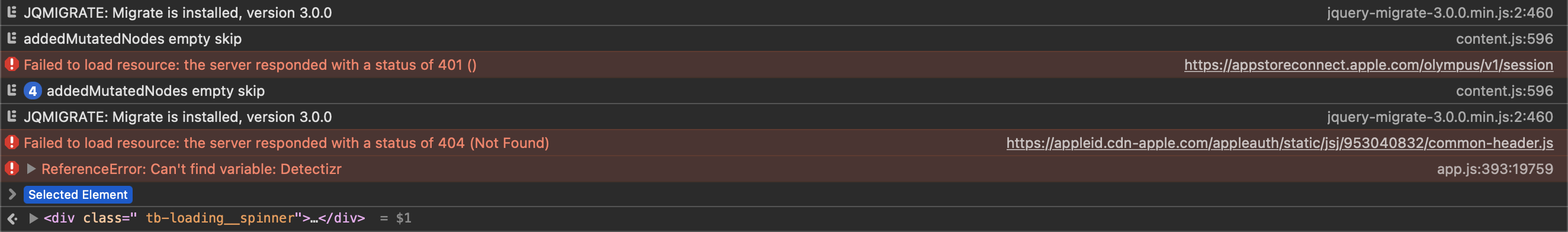 The console says: ReferenceError: Can't find variable: Detectizr