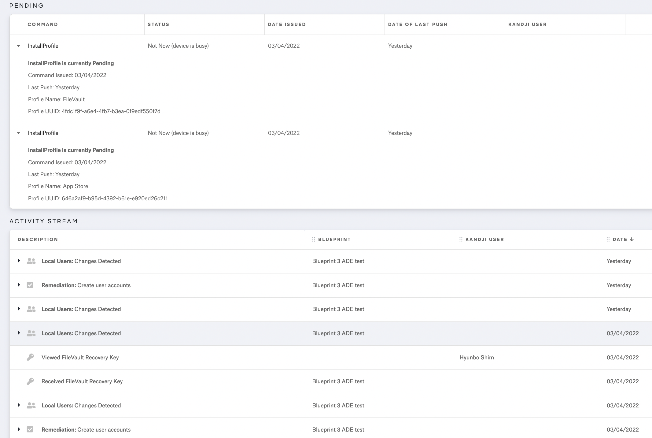 Modifying custom profile for this Macbook Pro M1 was all pending with error message something like "Device is busy" including removing profile, installing profile. I was trying to remediate the issue by un-enrolling and re-enrolling. Unfortunately I did not screen shot the error message.