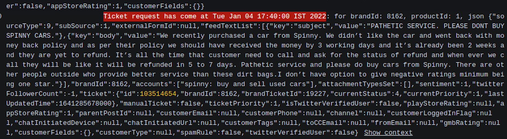 I have attached the images of both, review given at AppStore and the request received to create the ticket.