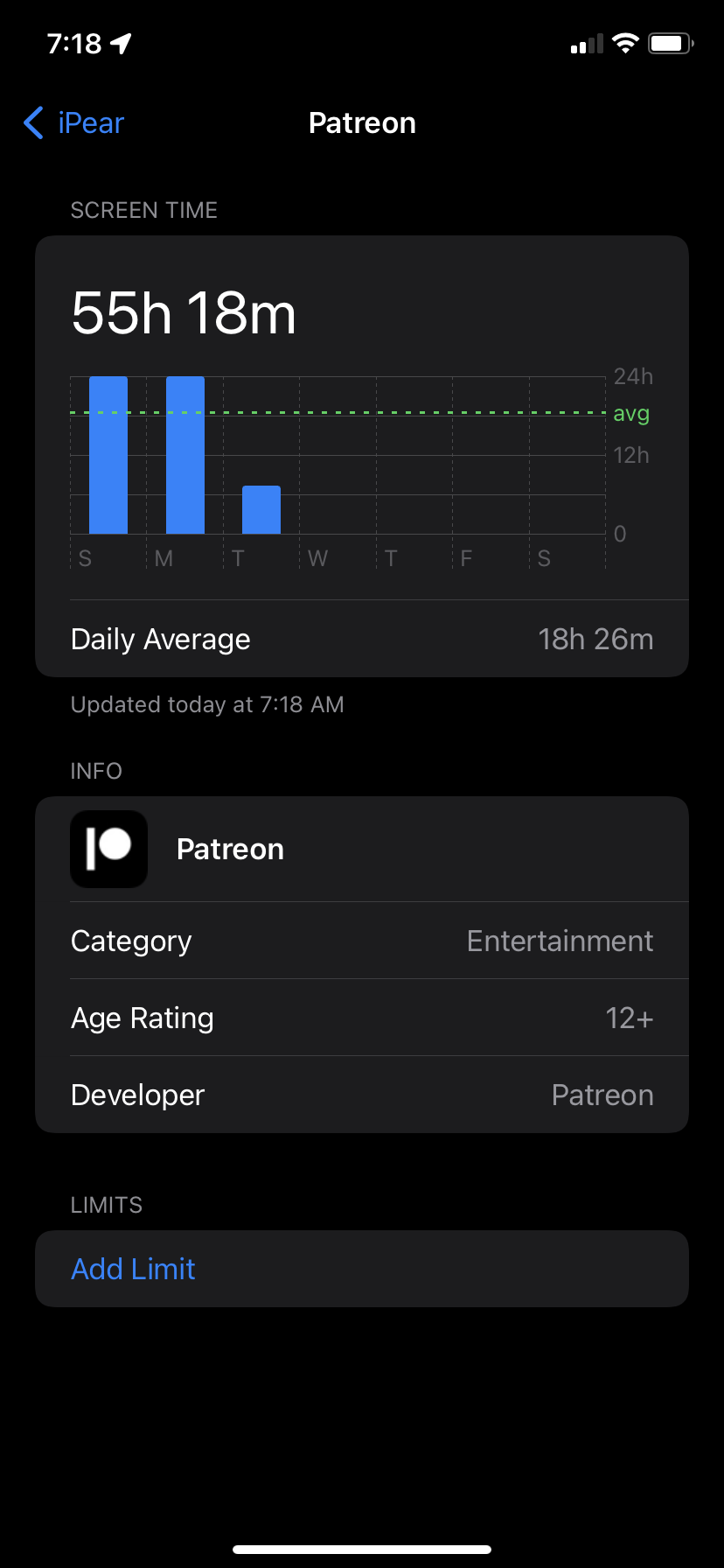 Hello, my screen time says that I had the Patreon app open for 55 hours in the last 2 days. I do not have the Patreon app nor have I never downloaded that app.