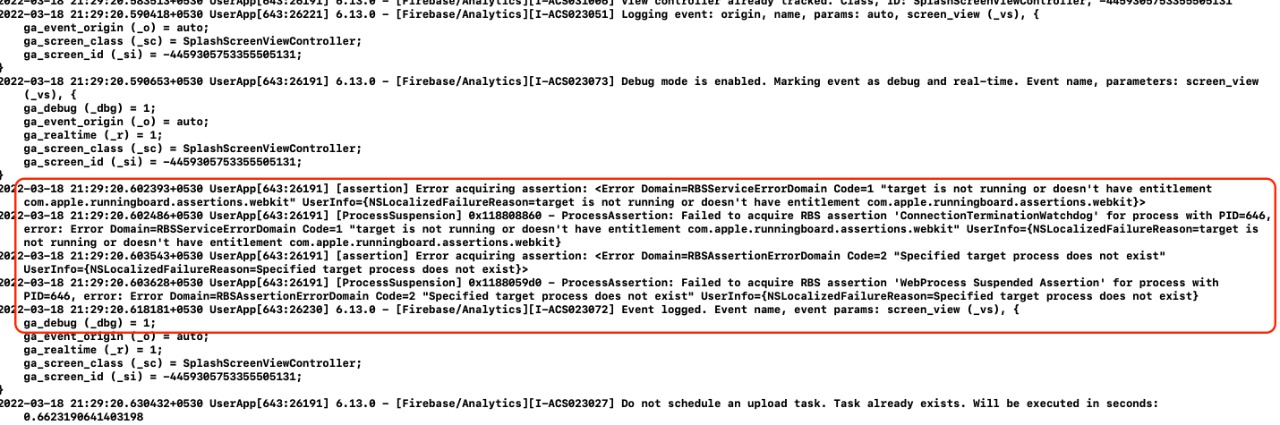 Make sure firebase is setup properly: (assertion Error acauirina assertion: <Error Domain=RBSServiceErrorDomain Code=1 "target is not runnina or doesn't have entitlement