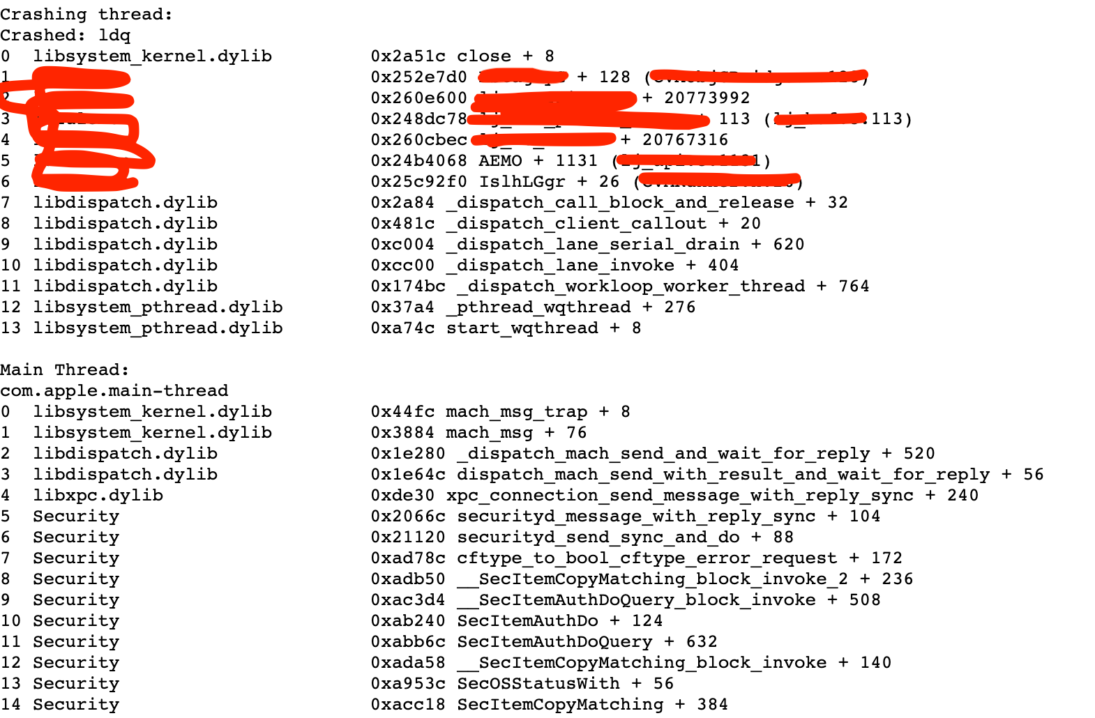 Here's the crash log and from top is close + 8, stack num.1 is a CFRelease(a) function, we do check if a is null before call CFRelease on it. And the for next a few lines are (number 2-6), we don't see any of those function calls open or close a file, no socket network call at all. No sqlite, coredata or even dup and etc... Is there a memory management issue which makes the a point to somewhere else which is the file descriptor?