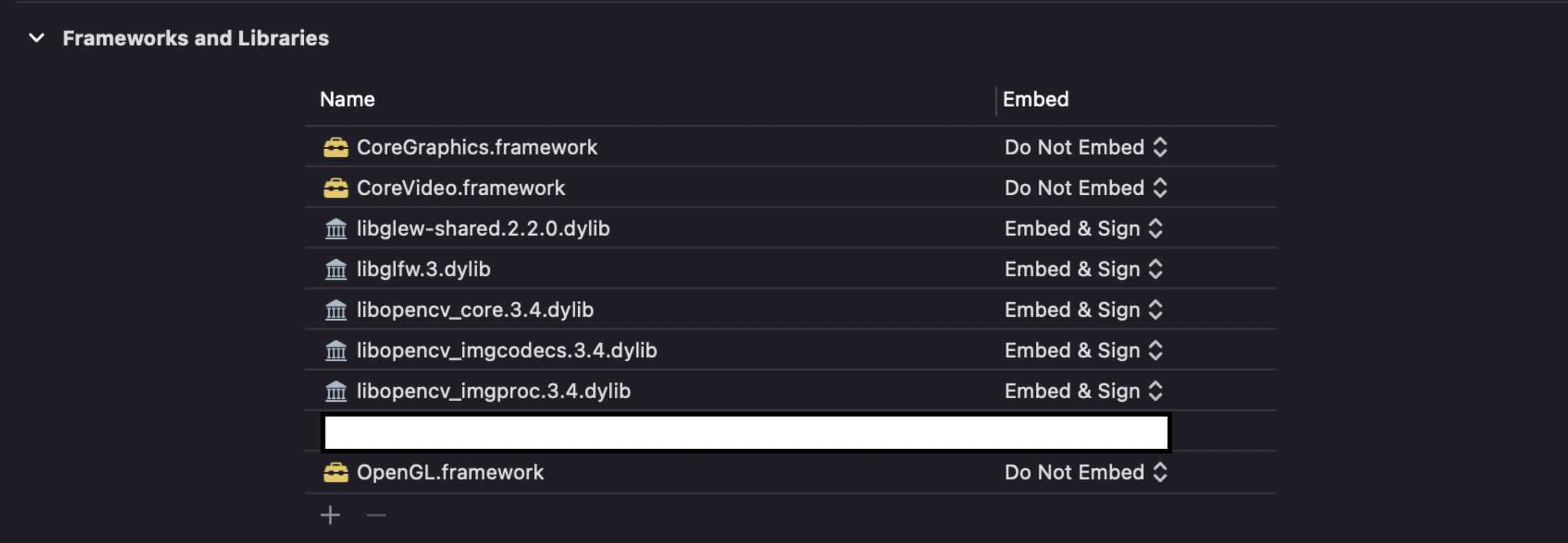 Added the dylibs (libopencv_core.3.4.dylib, libopencv_imgcore.3.4.dylib), and necessary frameworks in the Framework and Libraries section.